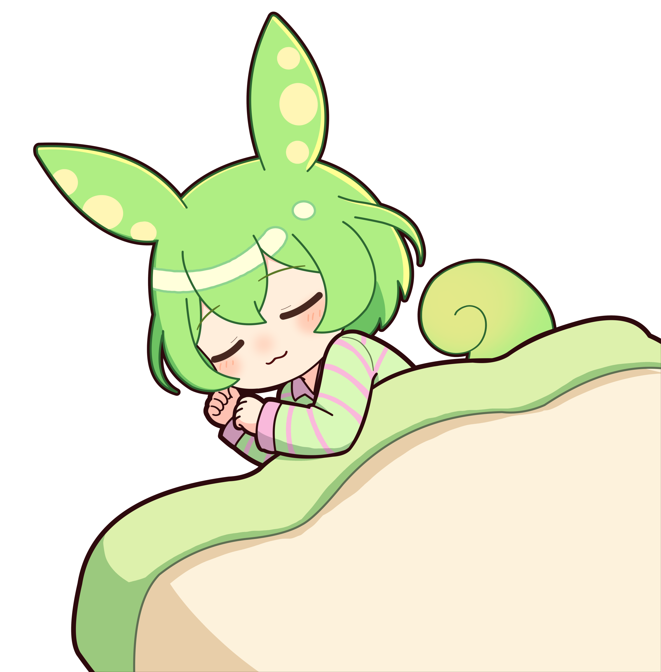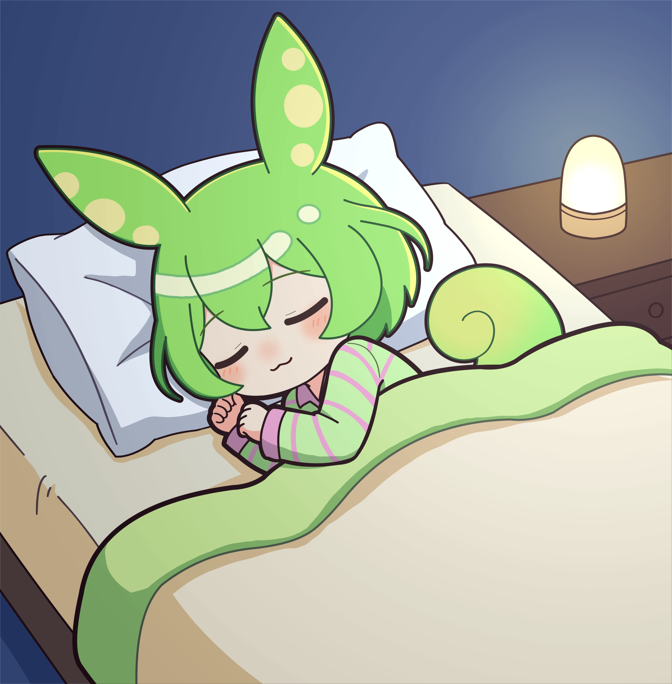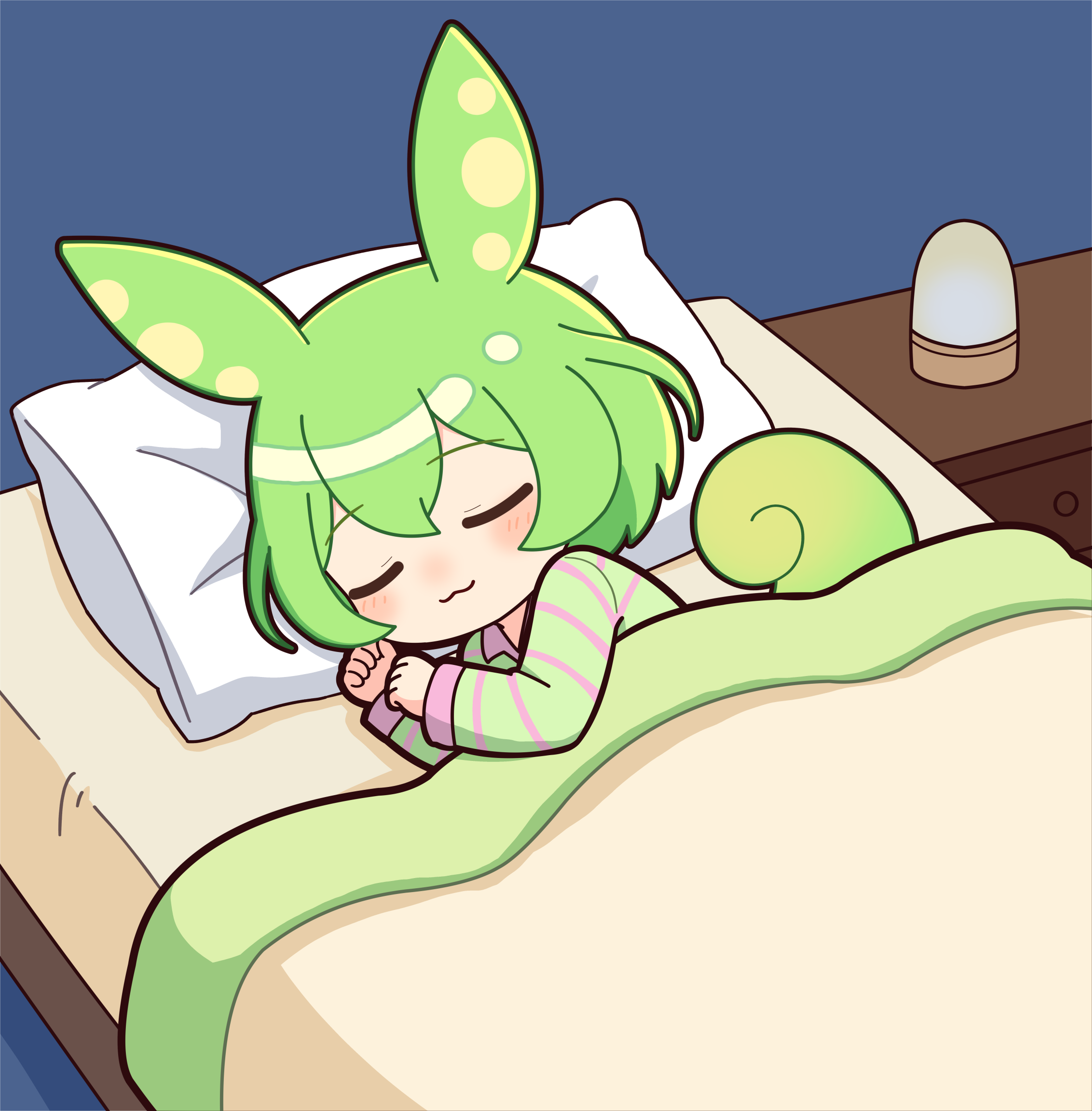 パジャマを着てベッドで寝ているずんだもんのイラストです。