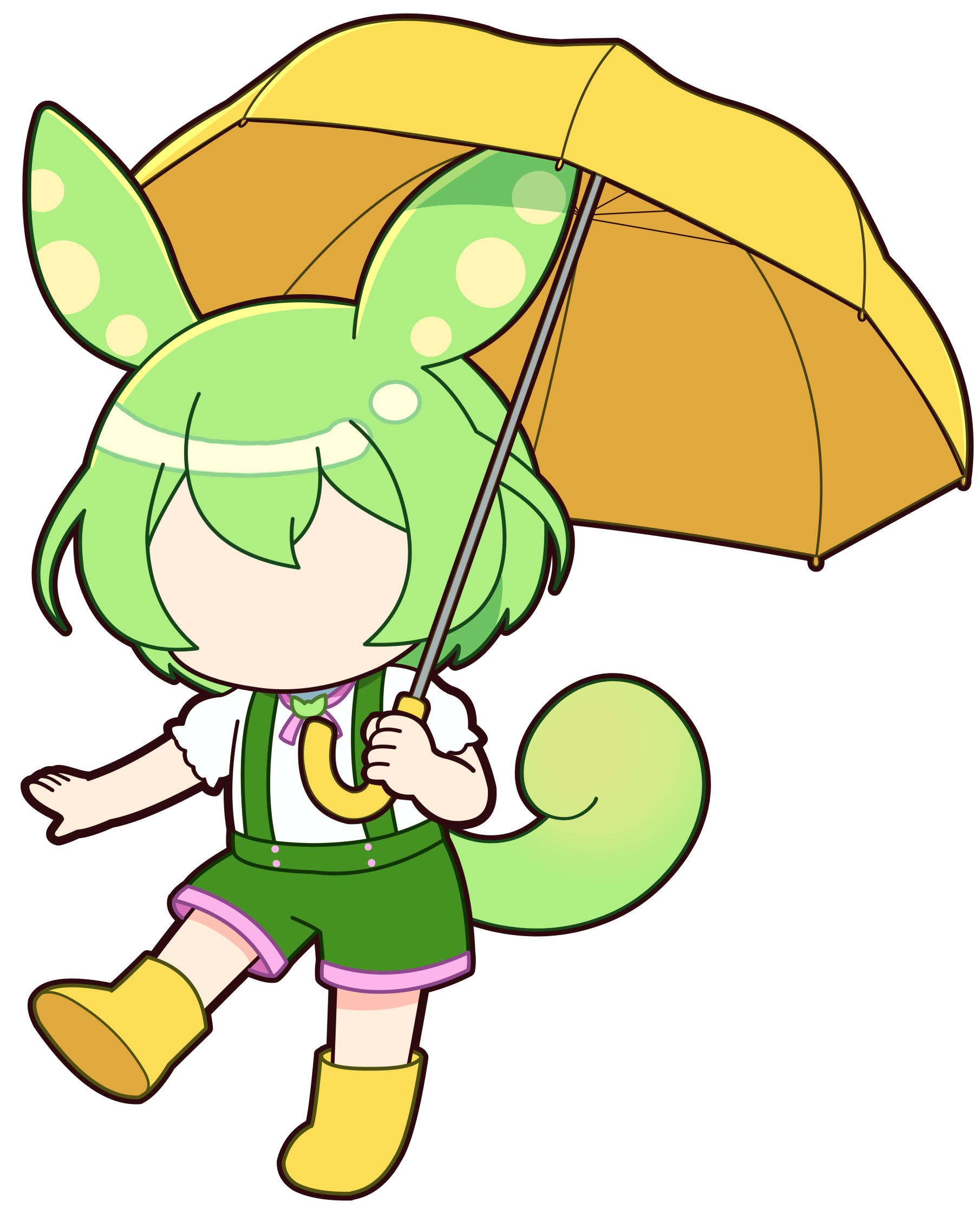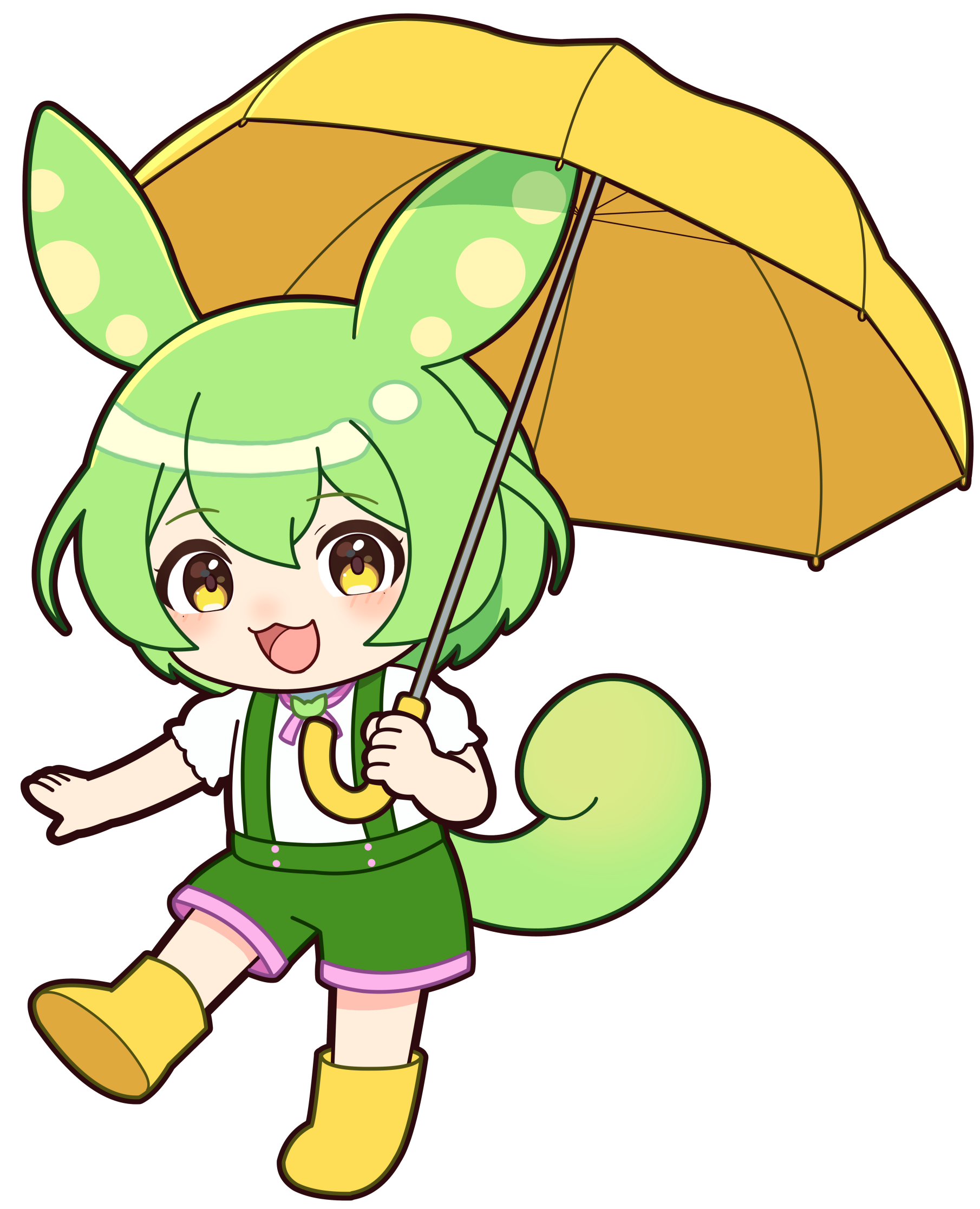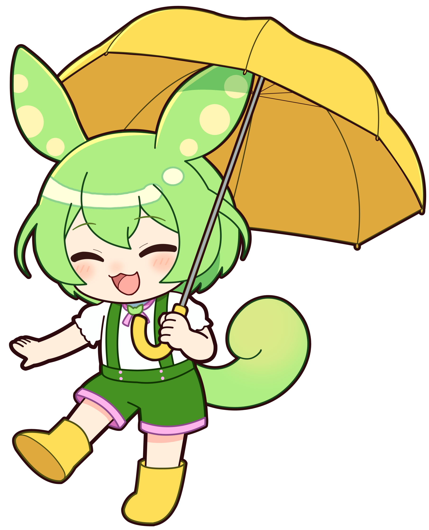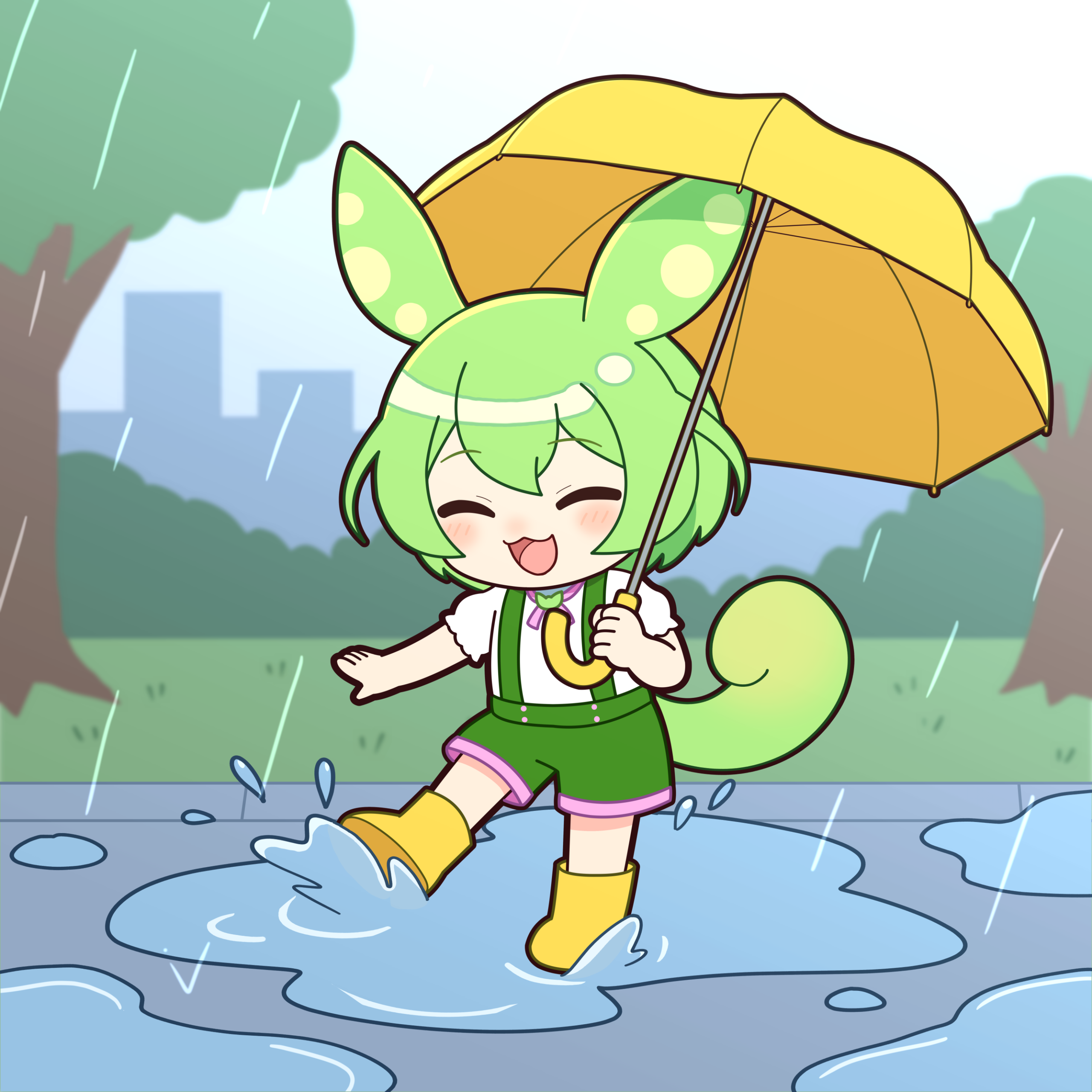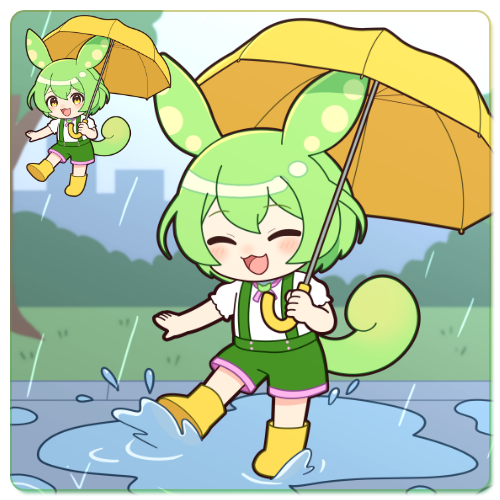 傘を持ち、長靴を履いて水たまりで遊んでいるずんだもんのイラストです。